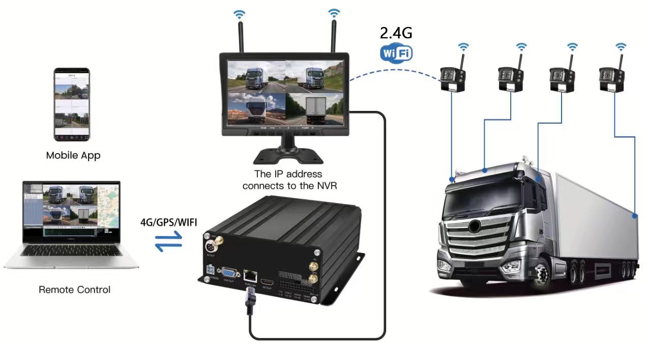Carleader 10,1 Inch 4CH Wireless HDD Mobile NVR System, vrhunski mobilni NVR sistem, ki je zasnovan za upravljanje voznega parka. Sistem uporablja 4 brezžične IP kamere v paru z 10,1-palčnim brezžičnim monitorjem prek signala 2,4 GHz, nato poveže monitor in NVR s priključkom RJ45. ni potrebe po dodatnih težavah z ožičenjem, bolj učinkovito pri namestitvi in upravljanju voznega parka.