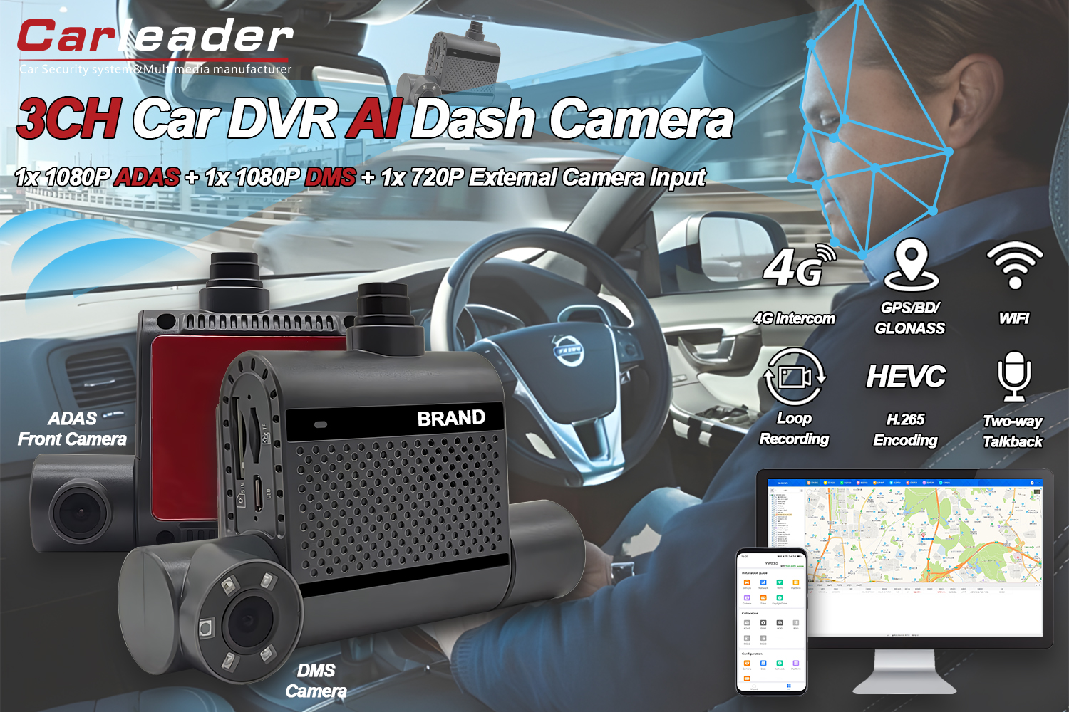 Carleader 3CH HD DVR snemanje AI Dash Cameraje naprava profesionalnega razreda v vozili, ki vključuje HD slikanje, inteligentno pomoč vožnje in varnost podatkov, zasnovana za komercialne flote, logistiko in posamezne uporabnike za celovito izboljšanje varnosti in učinkovitosti upravljanja.