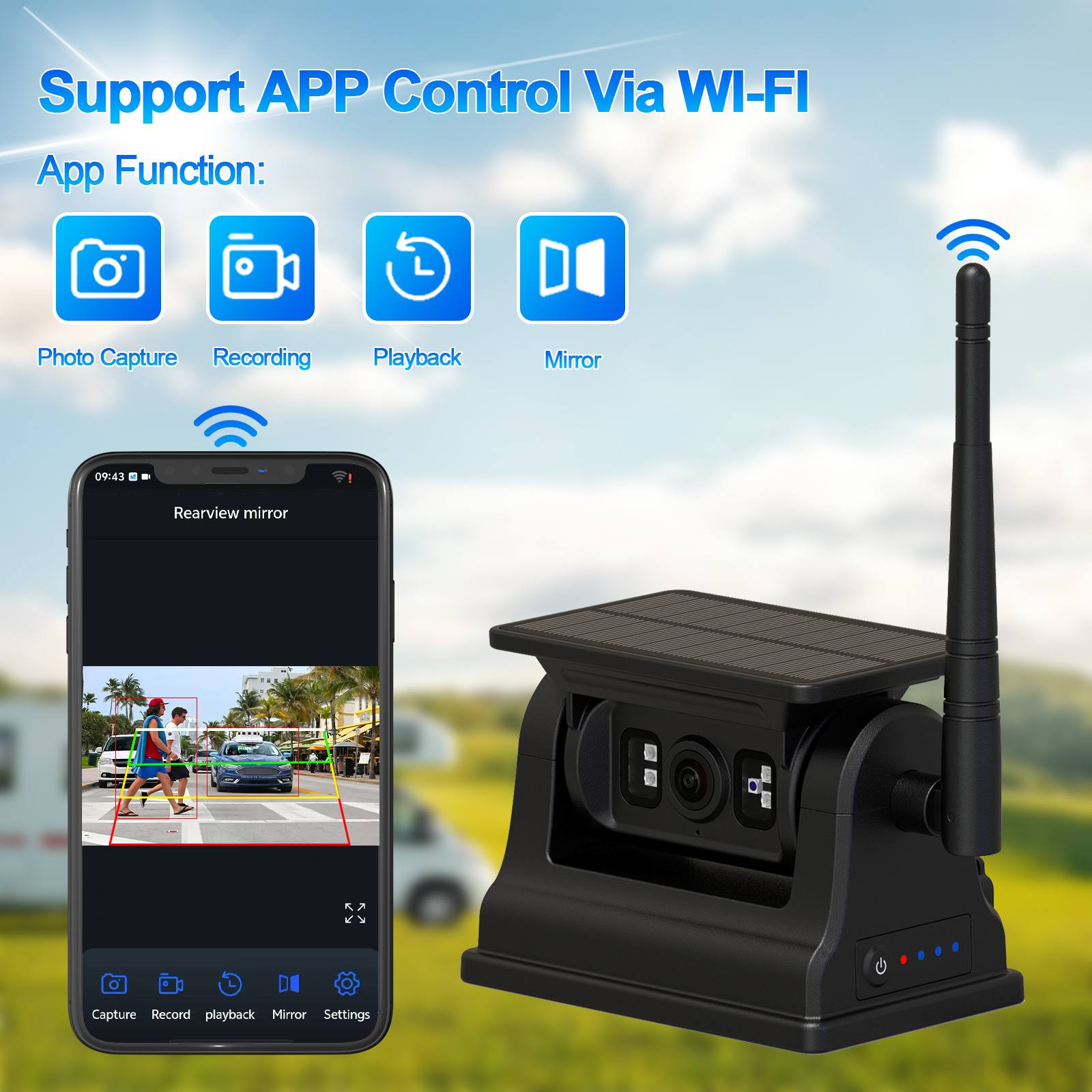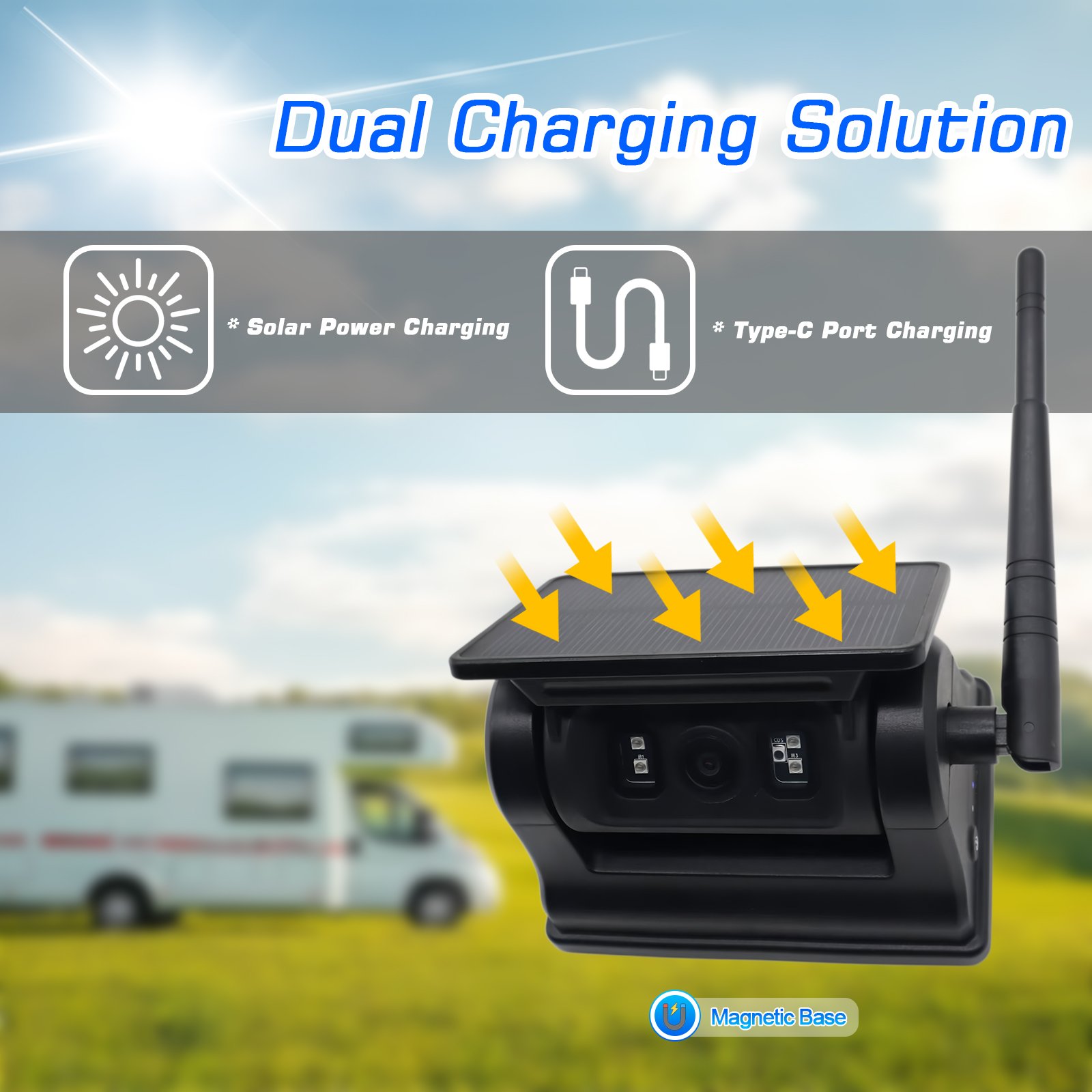 Varnost avtodomov in avtodomov: samozavestno parkirajte in vzvratno vozite v natrpanih kampih. Varnost vleke: spremljajte prikolice ali čolne v realnem času. Terenske pustolovščine: brez skrbi krmarite po skalnatih poteh. Ali splošno spremljanje od zadaj, Carleader 1080P magnetna solarna WiFi brezžična rezervna kamera za avtodome za IOS Android zagotavlja zmogljivost tam, kjer je najbolj pomembno.