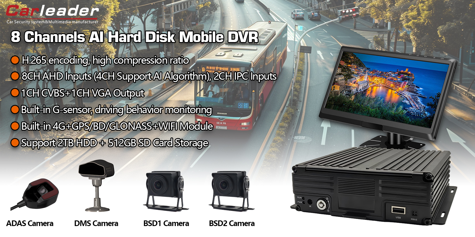 Carleader8-kanalni AI HDD mobilni DVR podpira ADAS+DMS+BSDje odlična rešitev za komercialne vozne parke, javni prevoz, logistiko in posebna vozila, ki zahtevajo: