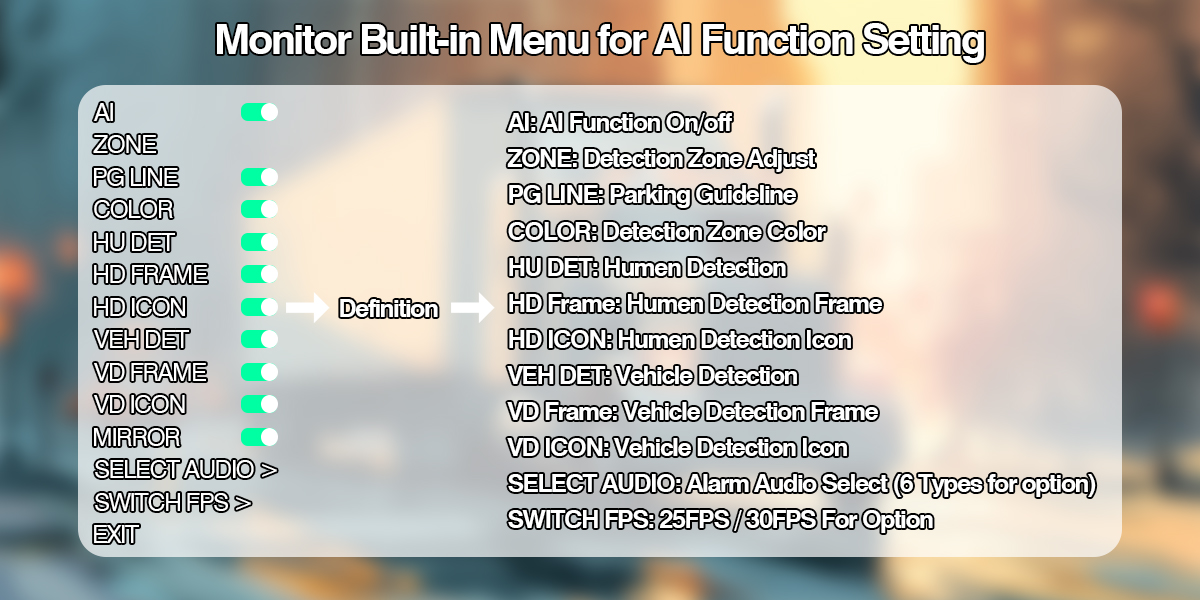 Carleader7-palčni sistem za spremljanje zaznavanja mrtvega kota z umetno inteligenco BSD podpira kalibracijo z umetno inteligenco, rešitev za kamero z umetno inteligenco, ki podpira zaznavanje pešcev, zaznavanje vozil, znatno poveča varnost med vožnjo, monitor z vgrajenim menijem za umerjanje z umetno inteligenco, uporabniku omogoča prilagajanje območja zaznavanja, vklop/izklop barvnega prikaza območja zaznavanja, vrsto zvoka alarma, prikaz ikon vozila in pešca, izbiro predmeta zaznavanja itd.