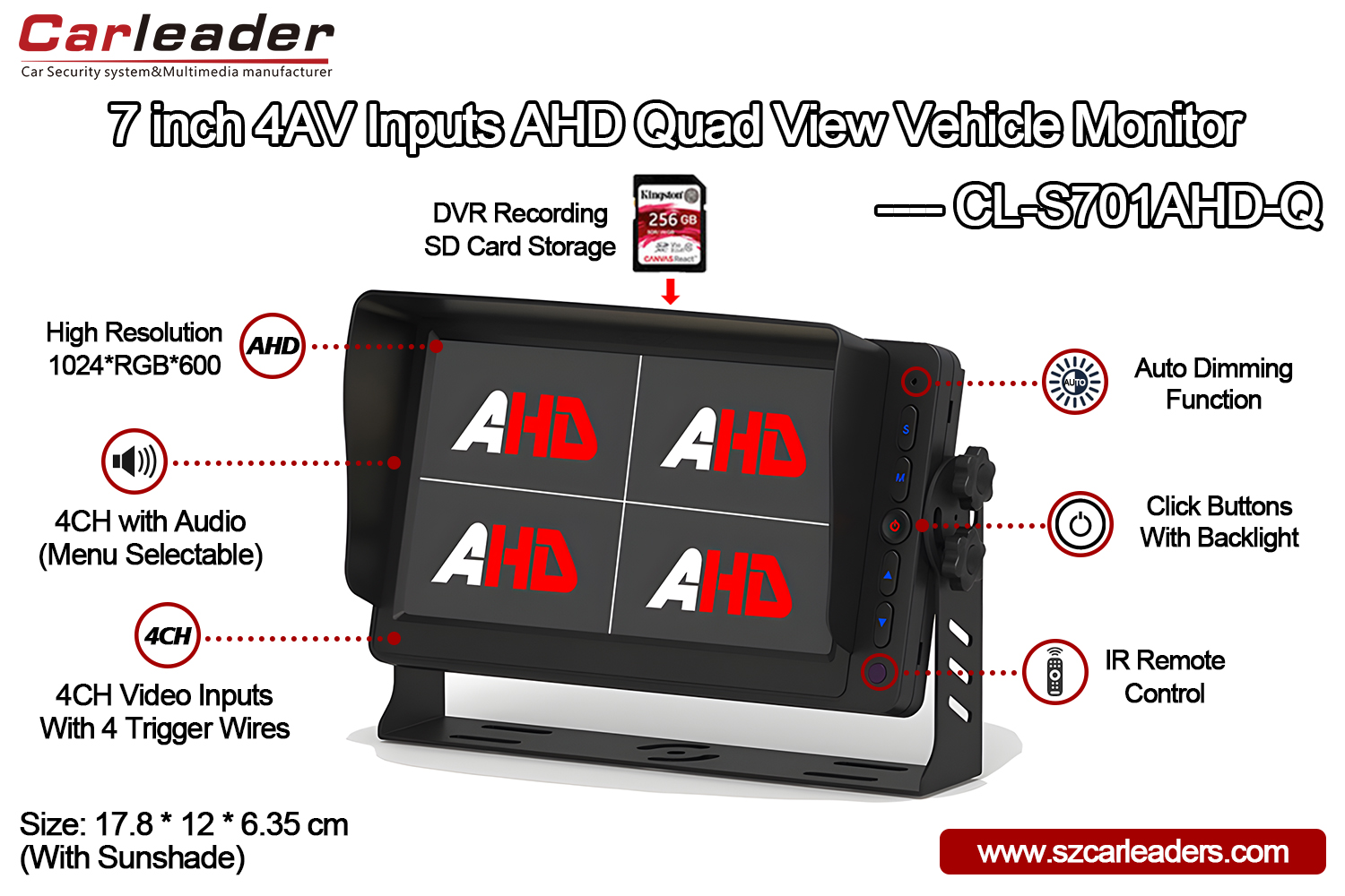 Carleader vam s ponosom predstavlja naše7-palčni 4CH AHD vhodni monitor Quad View Display, zasnova s štirimi pogledi lahko podpira 4 kanale za kamero vozila, kot so sprednji pogled, stranski pogled x2, zadnji pogled, omogoča voznikom velikih vozil (avtobusi, tovornjaki in dostavna vozila, da med upravljanjem vozila spremljajo več pogledov okolice).