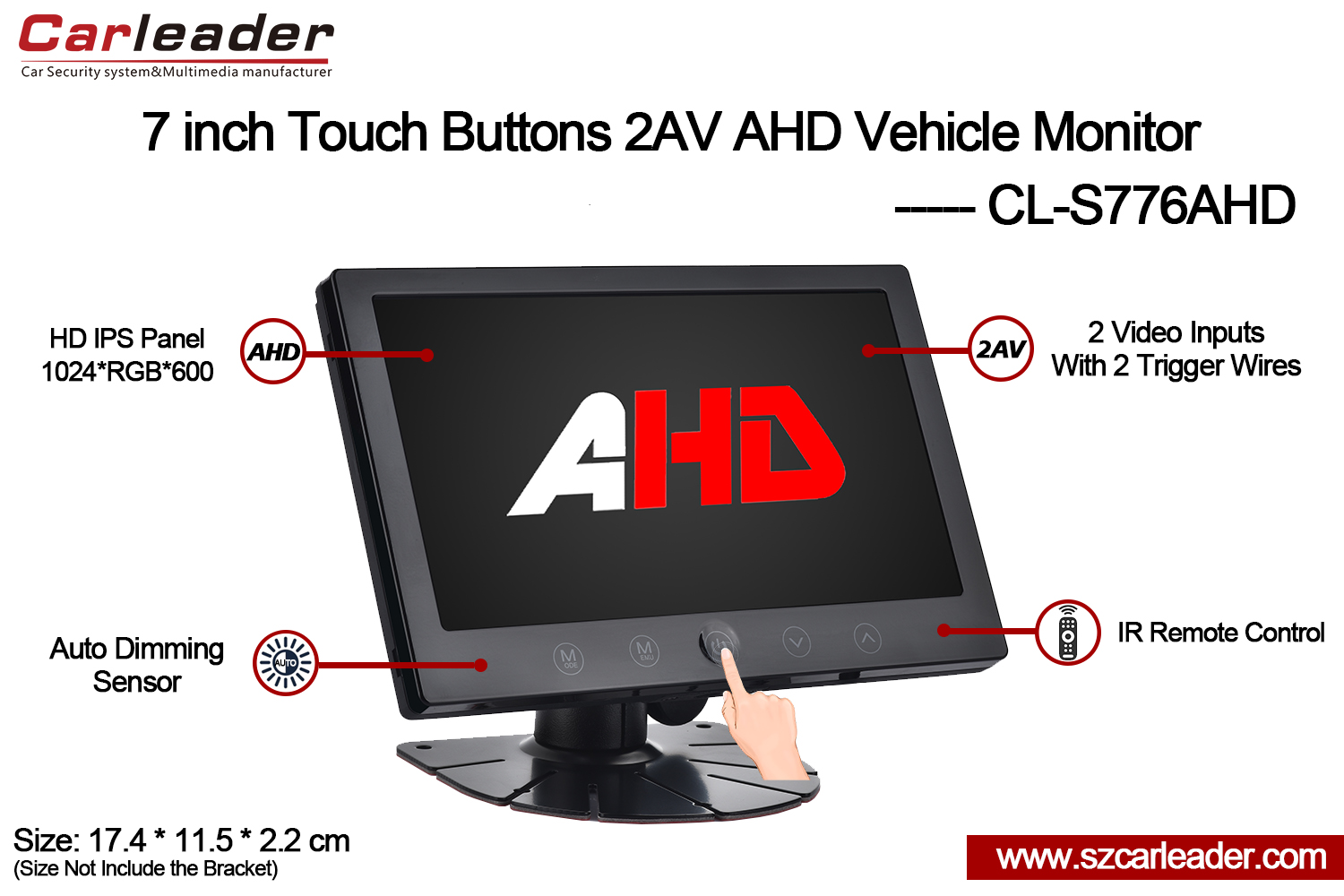 Carleader7-palčni IPS zaslon 2CH AHD vhod Gumbi na dotik Monitor težkih vozilidealen za avtomobilsko, varnostno, pomorsko in industrijsko uporabozdružuje vzdržljivost, prilagodljivost in visokokakovostno delovanje zaslona v enem zanesljivem paketu.
