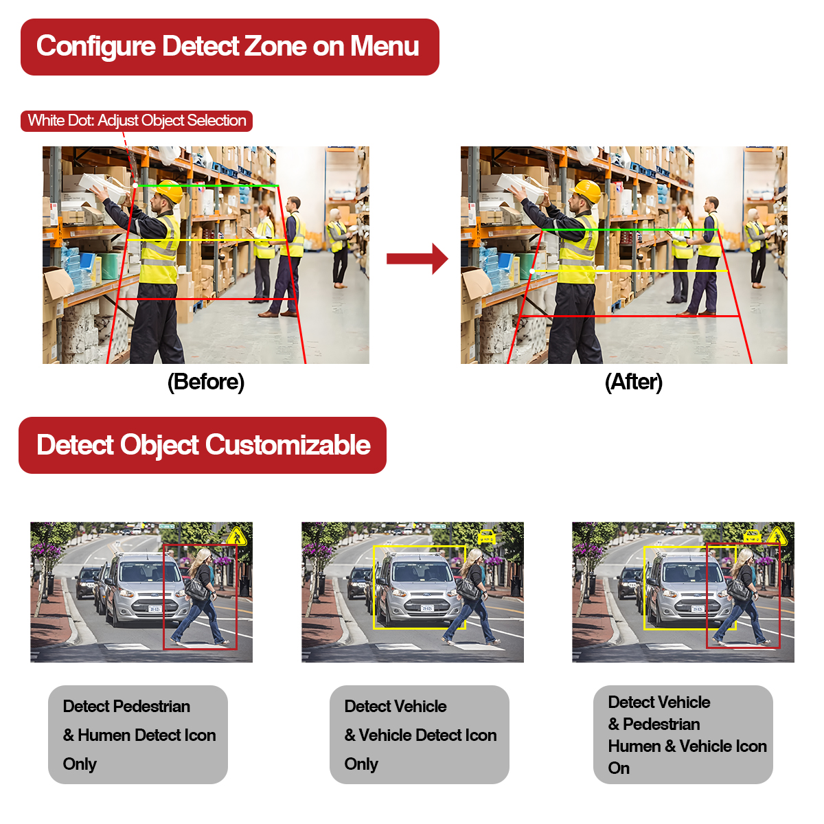 Ta kamera z umetno inteligenco z vgrajeno funkcijo opozorilne lučke se bo barva svetlobe spremenila v ustrezno barvo, ko predmet zaznavanja vstopi v drugo območje zaznavanja (rdeča, rumena, zelena). Integrirajte tudi z alarmom za alarmiranje okoliških pešcev in vozil, ki se približujejo vašemu vozilu.