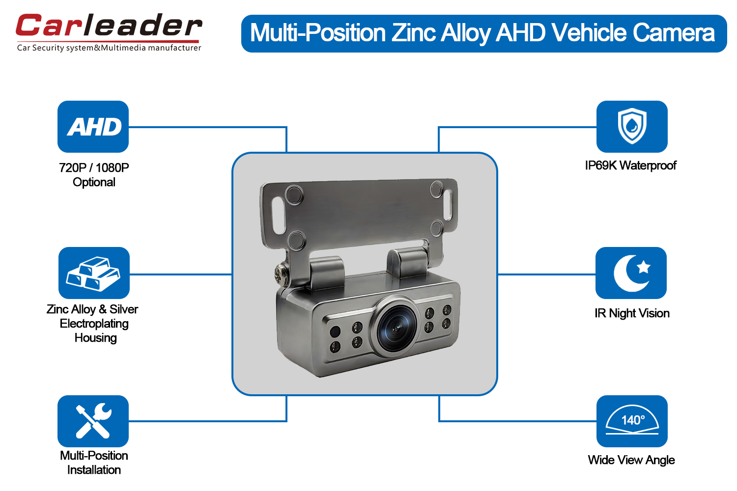 CarleaderAHD srebrna galvanizirana kamera za vzvratno vožnjo vozilaje primeren za 5-palčni, 7-palčni, 9-palčni ali 10,1-palčni monitor vozila. Vodoodporna avtomobilska kamera za vzvratno vožnjo z nočnim vidom s širokim vidnim kotom 140 stopinj, ki vozniku zagotavlja dobro izkušnjo vida in izogibanje prometnim nesrečam. Nastavite lahko želeni kot in nato pritrdite matice in vijake, da dokončate namestitev. Vzvratna kamera z visoko ločljivostjo signala AHD 1080p ima jasno kakovost slike.