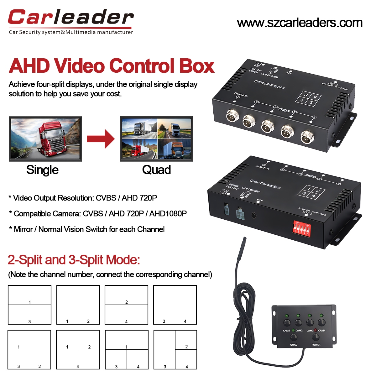 Pogovorimo se o tem, kaj morate vedeti o CarleaderjuVideo procesor AHD Quad View Split Boxza težka tovorna vozila. AHD quad split nadzorna omarica je pomembna naprava za nadzorni sistem vozila CCTV. Video split nadzorna omarica avtobusnega tovornjaka podpira pretvorbo enega monitorja v monitor s štirimi pogledi in se lahko poveže s 4 avtomobilskimi kamerami AHD. Sledi podrobna razlaga funkcij, lastnosti in tipičnih primerov uporabe videonadzorne omarice vzvratne kamere AHD.
