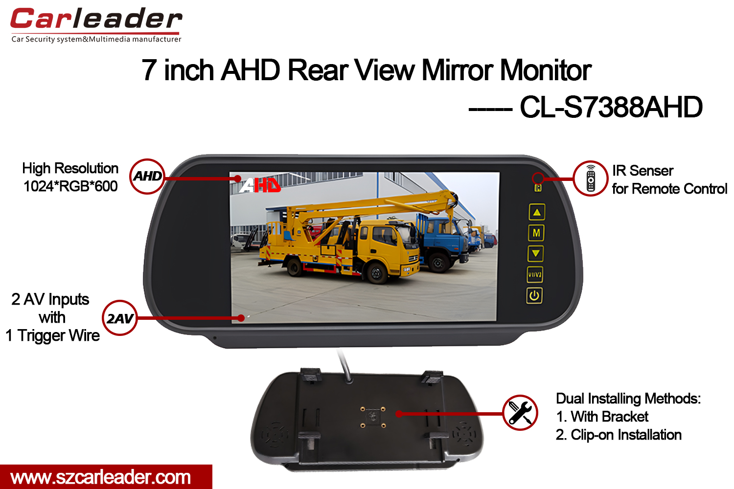 Carleader7-palčni monitor AHD z vzvratnim ogledalom TFT LCDje visoko zmogljiv 7-palčni monitor AHD za avtomobilsko ogledalo, zasnovan za zagotavljanje izjemne jasnosti in vsestranskosti za sodobne sisteme za spremljanje vozil. Z združevanjem naprednih funkcij z uporabniku prijazno zasnovo ta monitor zagotavlja zanesljivo delovanje v različnih voznih razmerah.